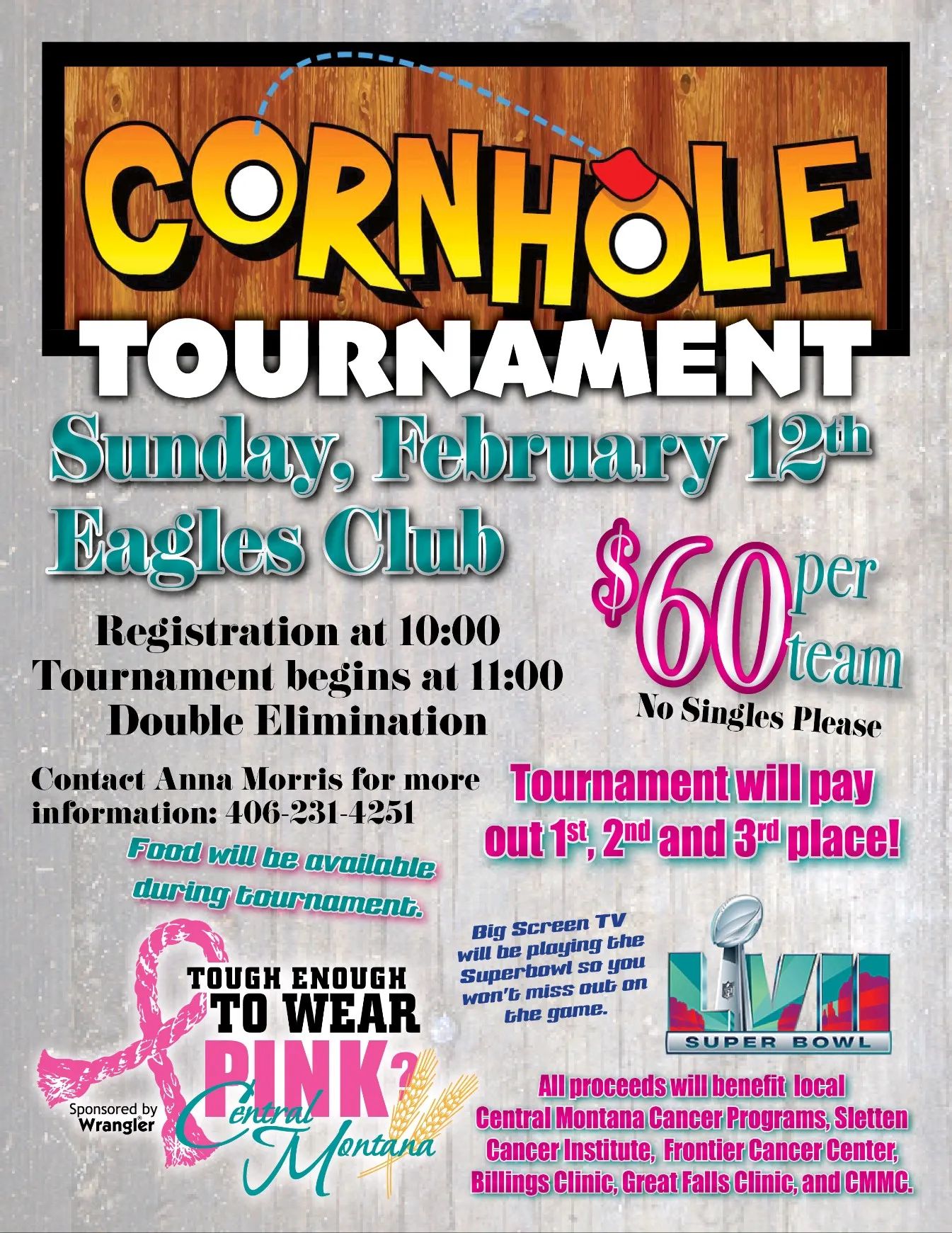 The Eagles Club, along with Tough Enough to Wear Pink will be hosting a Corn Hole Tournament, Sunday, Feb. 12th at 10am. The first bags will be thrown at 11am. $60 per team entry fee, pays out 1st, 2nd, 3rd places.