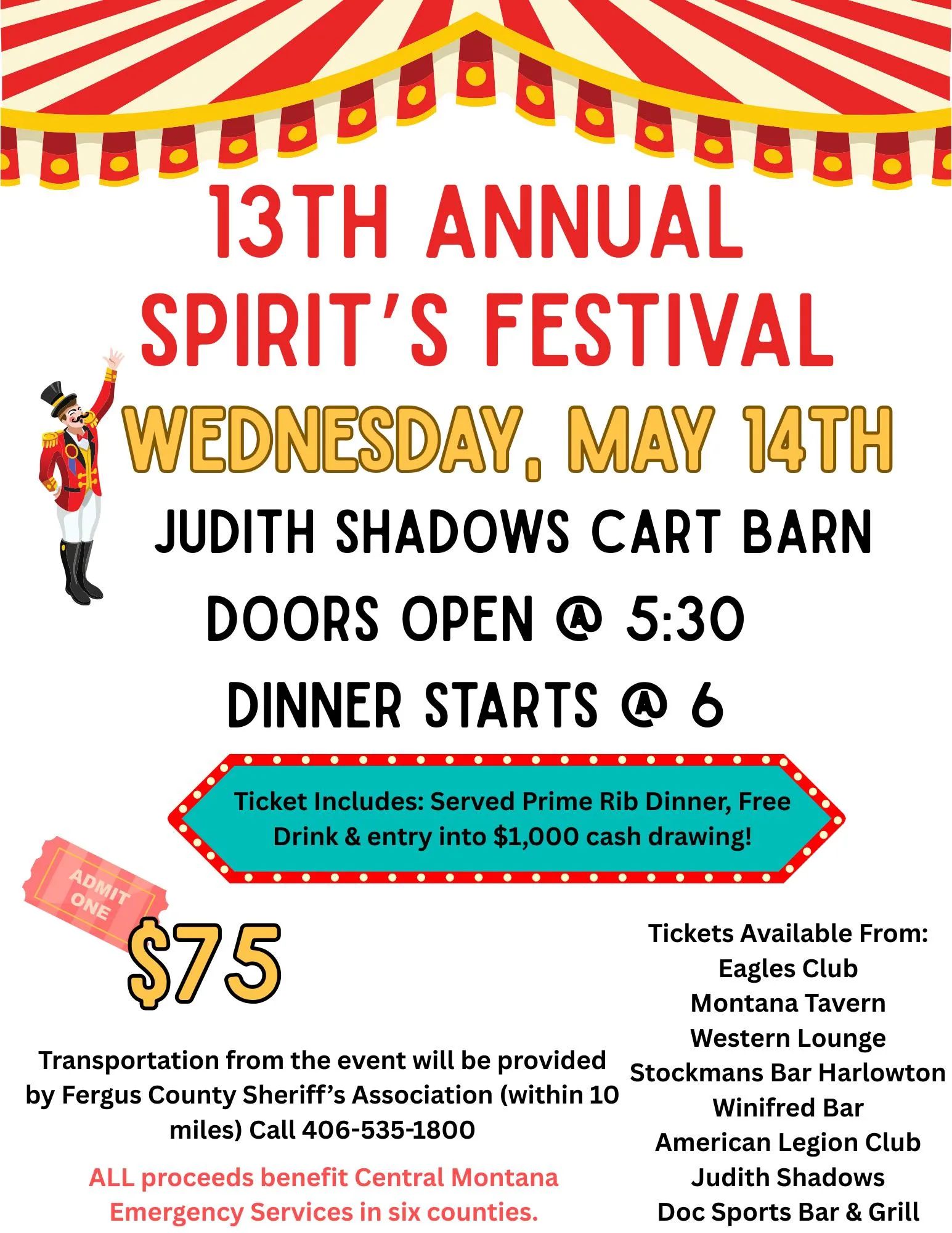 Looking for a way to give back to our local community while having some fun? Come to the 13th Annual Spirits Festival at the Judith Shadows! Lot's of free samples, a served prime rib dinner and lots of fun games with prizes. The best part? 100% of all the funds go back to our local Emergency, Fire & First Responders. All the money stays in our local community! Please join us for a night of fun. Fergus County Sheriff's Office will be offering rides home to anyone who needs one!