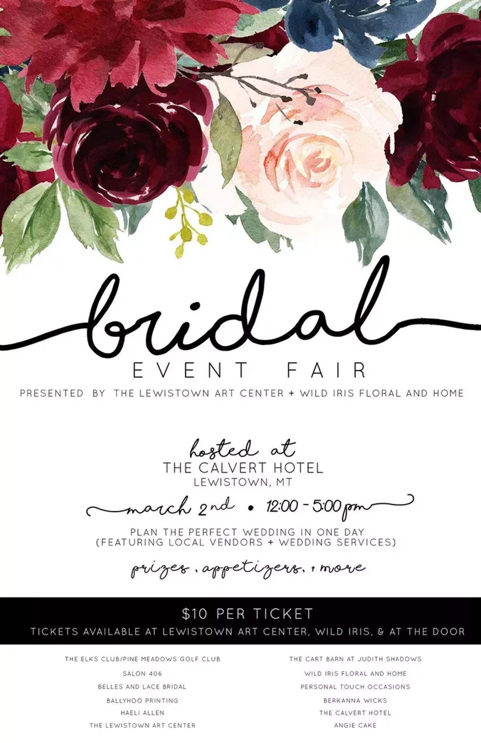 The Lewistown Art Center and Wild Iris Floral and Home present the area's best Bridal Event Fair. Meet vendors that can assist you in creating the perfect event -- all in one spot! Enjoy appetizers, prizes and more in the beautiful atmosphere of the Calvert Hotel.