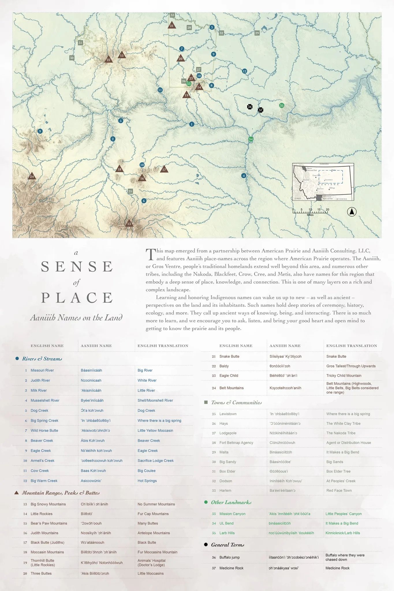 American Prairie is pleased to host “A Sense of Place: Exploring the Place Names of ’Ɔ́’ɔ́ɔ́ɔ́niinénn ɔh in Central-Montana” on Thursday, February 26, at 7 pm. This informative presentation by esteemed Aaniiih cultural leader and educator Terry Brockie will be held at the National Discovery Center, located at 302 W Main Street in Lewistown, Montana. Admission is free.