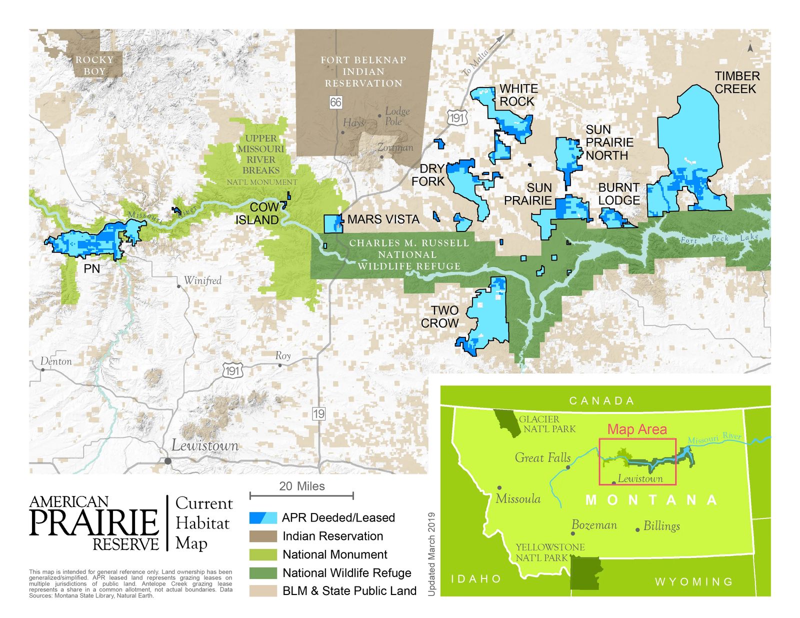 American Prairie Reserve (APR) is a freestanding Montana-based nonprofit that started to assemble land in 2004. The main focus is to purchase and permanently hold title to private lands that glue together a vast mosaic of existing public lands so that the region is managed thoughtfully and collaboratively with state and federal agencies for wildlife conservation and public access.