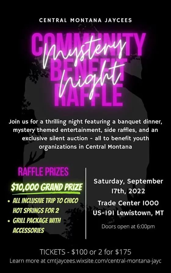 The grand prize is $10,000 cash! Second and third prizes are an all inclusive trip for two people to Chico hot springs and a grill package (including a grill). We will also have a side raffle and a silent auction at the event. Every ticket sold guarantees you one raffle entry and dinner at the event. Ticket sales are limited, be sure to buy before they are gone!