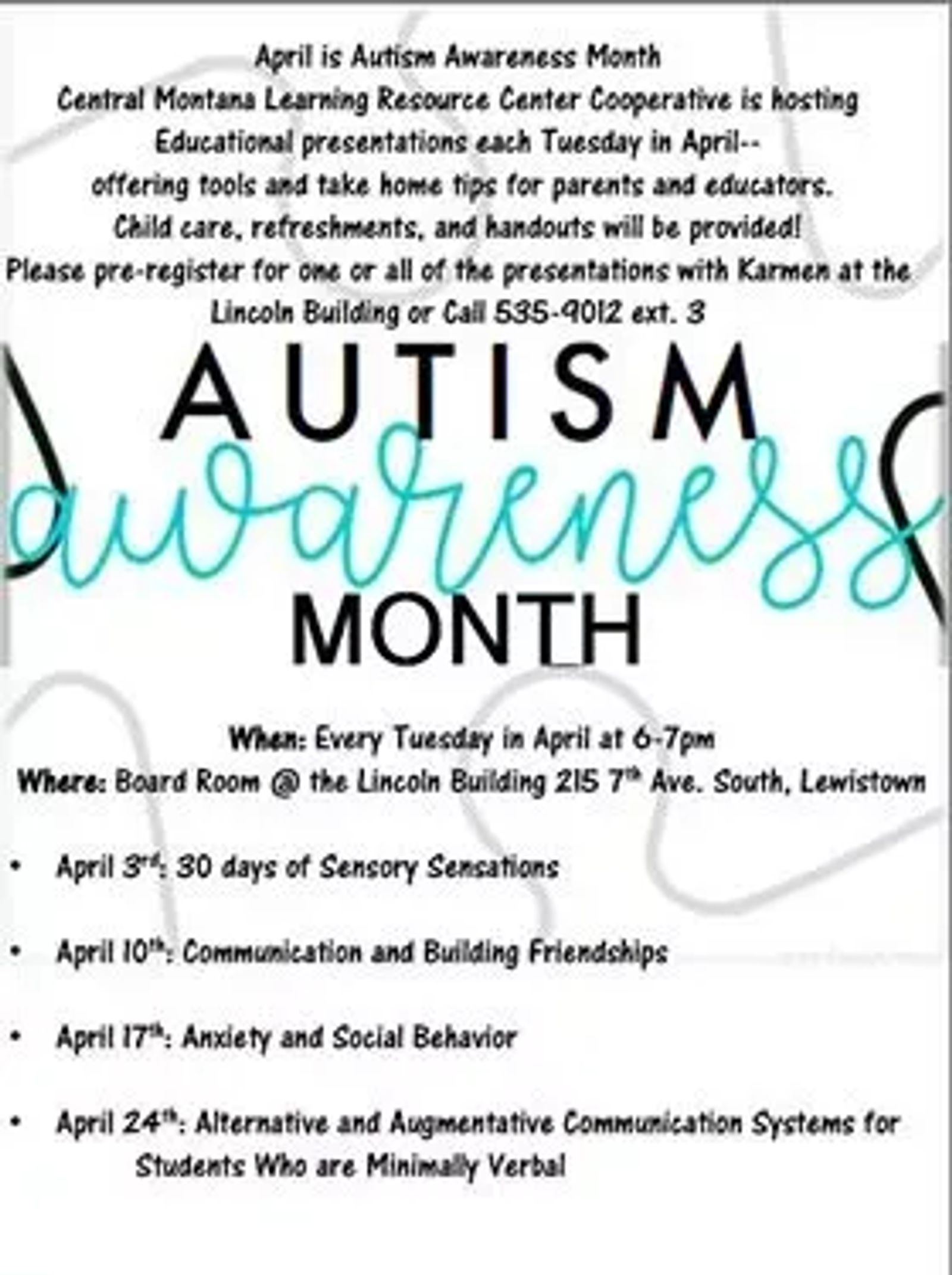 Central Montana Learning Resource Center Cooperative is hosing educational presentations each Tuesday in April--offing tools and take home tips for parents and educators. Child care, refreshments, and handouts will be provided! Pre-register for one or all of the presentations with Karmen at the Lincoln Building or call 535-9012 ext. 3.