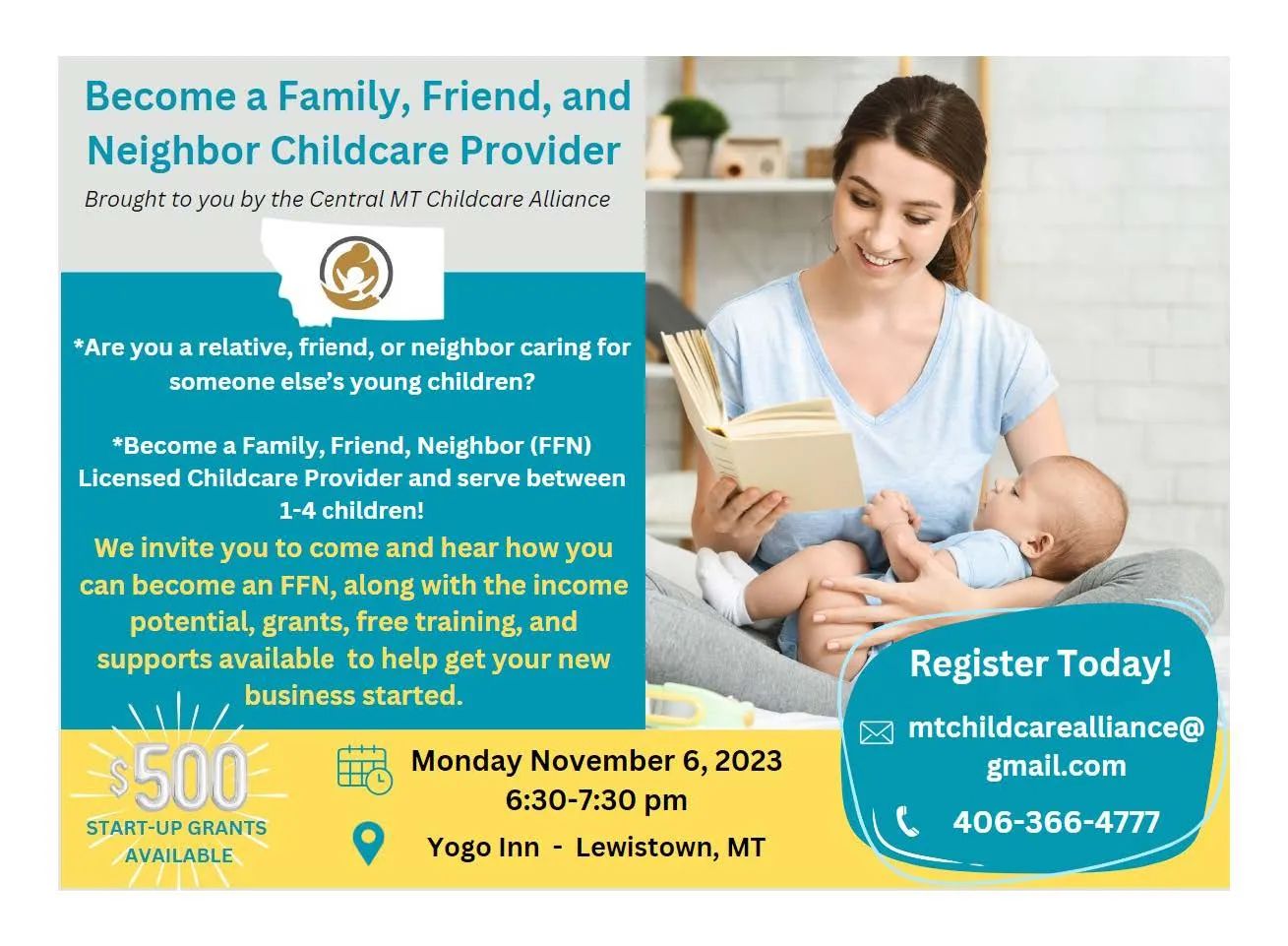 The Central Montana Childcare Alliance (CMCA) is hosting an open meeting for prospective partners interested in offering licensed childcare in their home. The meeting will be held on Monday, November 6 from 6:30-7:30pm at the Yogo Inn in Lewistown (211 E. Main). Attendees can earn up to $500 in grant funds to start a new childcare business!