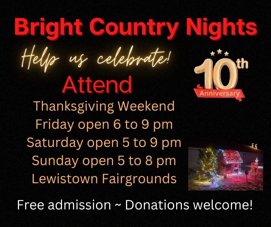 Bright Country Nights is held each year in Lewistown during the Thanksgiving weekend at the Fergus County Fairgrounds. The light show is open Friday, Saturday and Sunday evenings, and is held in conjunction with the Lewistown Christmas Stroll and Parade of Lights, with takes place on Black Friday in downtown Lewistown.