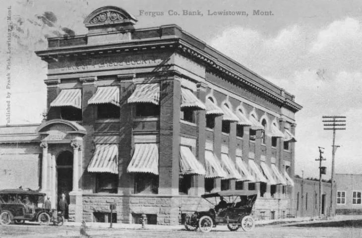T.C. Power, S.S. Hobson, and James H. Moe organized the Bank of Fergus County, the first bank in Lewistown, in 1887. John H. Kent and C.E. Bell were the architects for the 1904 Bank of Fergus County building. In 1915 P.T. Ainge of Spokane was engaged to “take charge of some very extensive improvements” to both the interior and exterior of the bank. The new façade was designed to “carry out the Judith Theatre scheme” and displays the terra cotta appointments that became popular when the arrival of the railroads made shipping imported building materials affordable. The building has housed banks, offices, retail space, restaurants, a barbershop, and was the Lewistown Elk Club for many years.