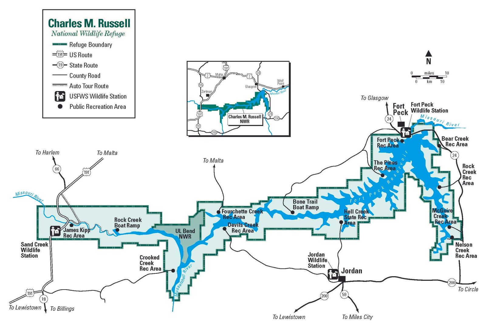 The headquarters for the Refuge Complex is located in Lewistown. Office hours are 7 am to 4 pm, closed weekends and holidays. Three staffed field stations are located around the Refuge. Sand Creek Wildlife Station is located 2 miles south of the Missouri River on the east side of U.S. Highway 191. Jordan Wildlife Station is located south of Montana Highway 200 in the town of Jordan. Fort Peck Wildlife Station is located east of Montana Highway 24 in the town of Fort Peck. Office hours for all field stations are 7 am to 4 pm and they are closed weekends and holidays.