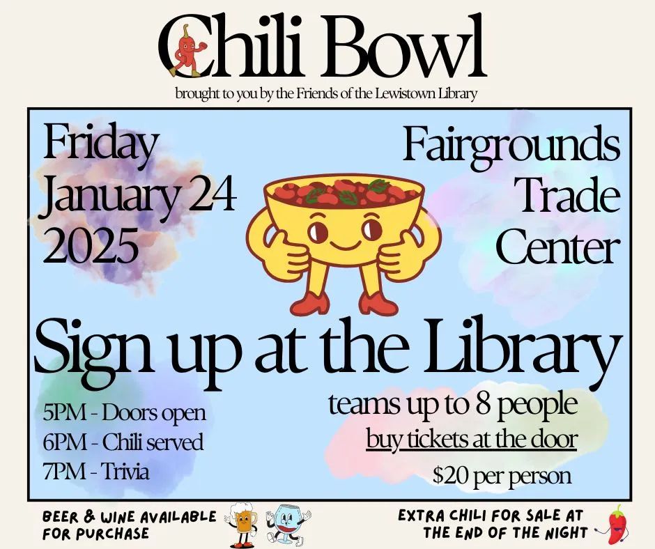 Chili Bowl is brought to you by the Friends of the Lewistown Library and all proceeds go to benefit the Lewistown Public Library.