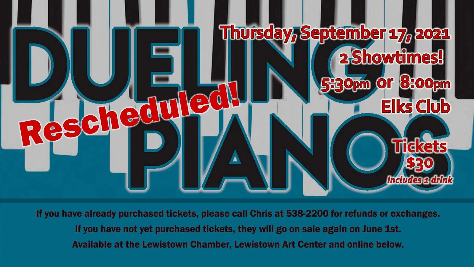 If you have already purchased tickets, please call Chris at 538-2200 for refunds or exchanges.