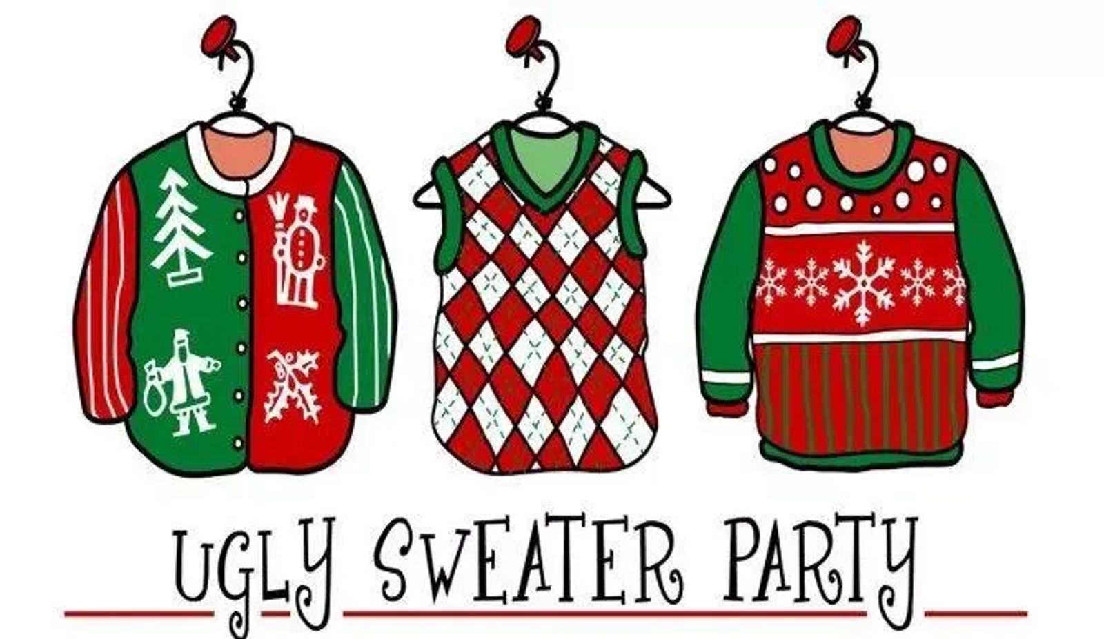 Prizes for Best Sweater, Most Original Sweater, Best Couple, Most Likely to Get Arrested, Most Festive.