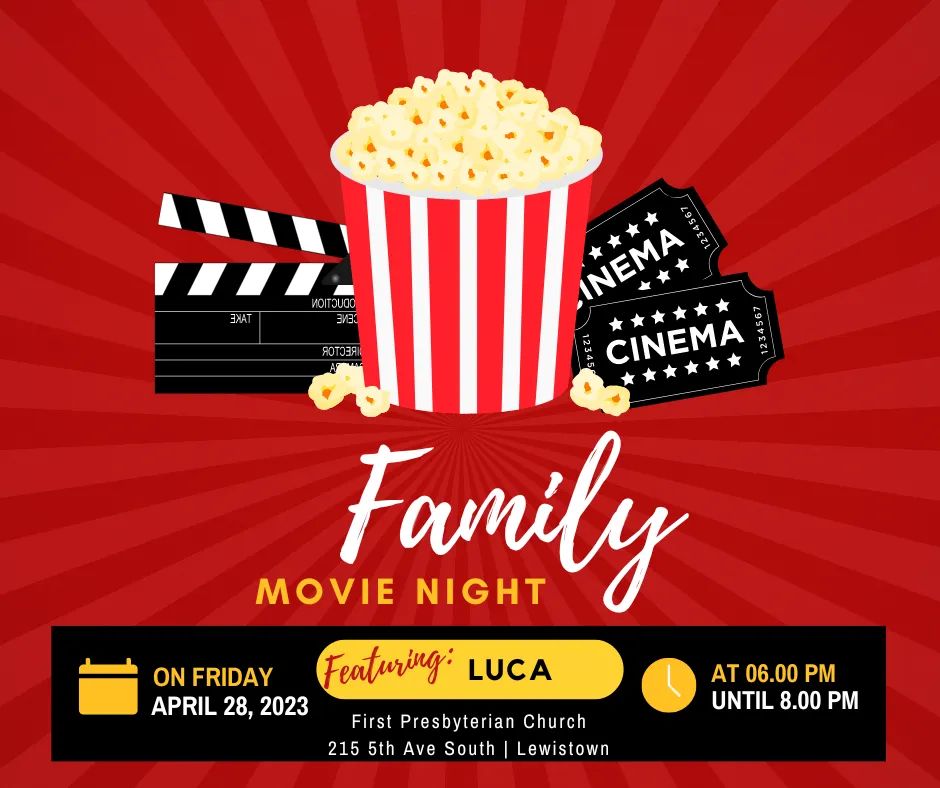 Family Movie Night featuring the film Luca. First Presbyterian will provide dinner, drinks & desserts. Families are encouraged to bring a blanket, stuffed animal and/or pillow and enjoy the movie!