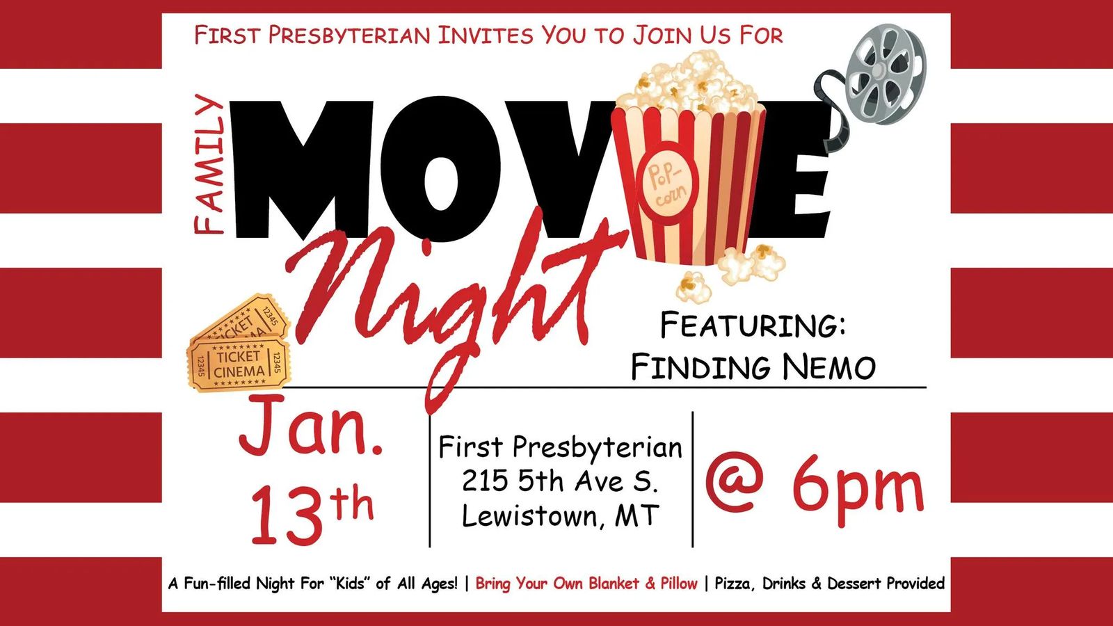 This Family Movie Night features the Finding Nemo. We encourage "kids" of ALL ages to join us for dinner, themed dessert and lots of fun! Don't forget your blanket, pillow, stuffed animal, slippers - come and be comfortable!