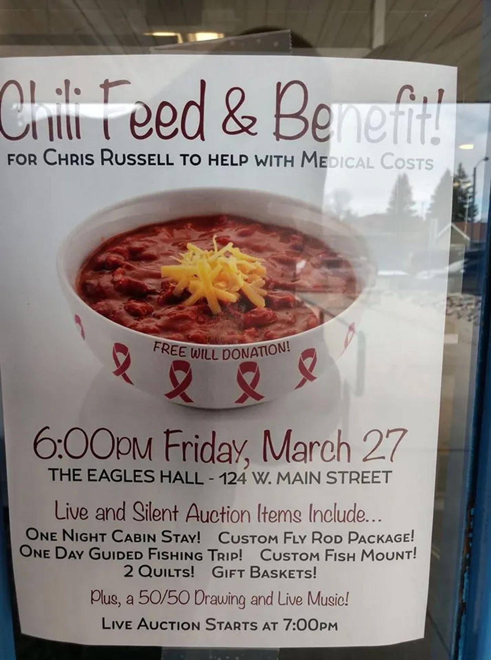Last spring Chris was diagnosed with breast cancer. In December Chris went in for a checkup and was diagnosed with head and neck cancer. Chris used all of her time off last spring to travel to Billings for her breast cancer treatments. She learned in December that she would have to spend 7 weeks in Billings receiving chemo and radiation. She also was unable to keep her job as a water therapist due to using all of her PTO last spring. This event is to help raise money to cover the huge expense we all know cancer is. There will be live auction and silent auction along with 50/50 raffle. Please come and help out this amazing wonderful family.