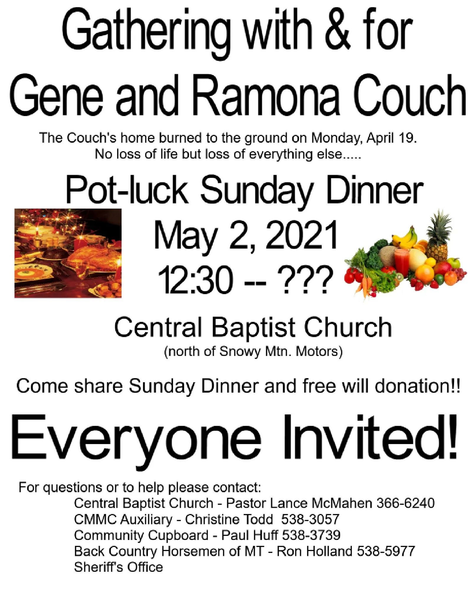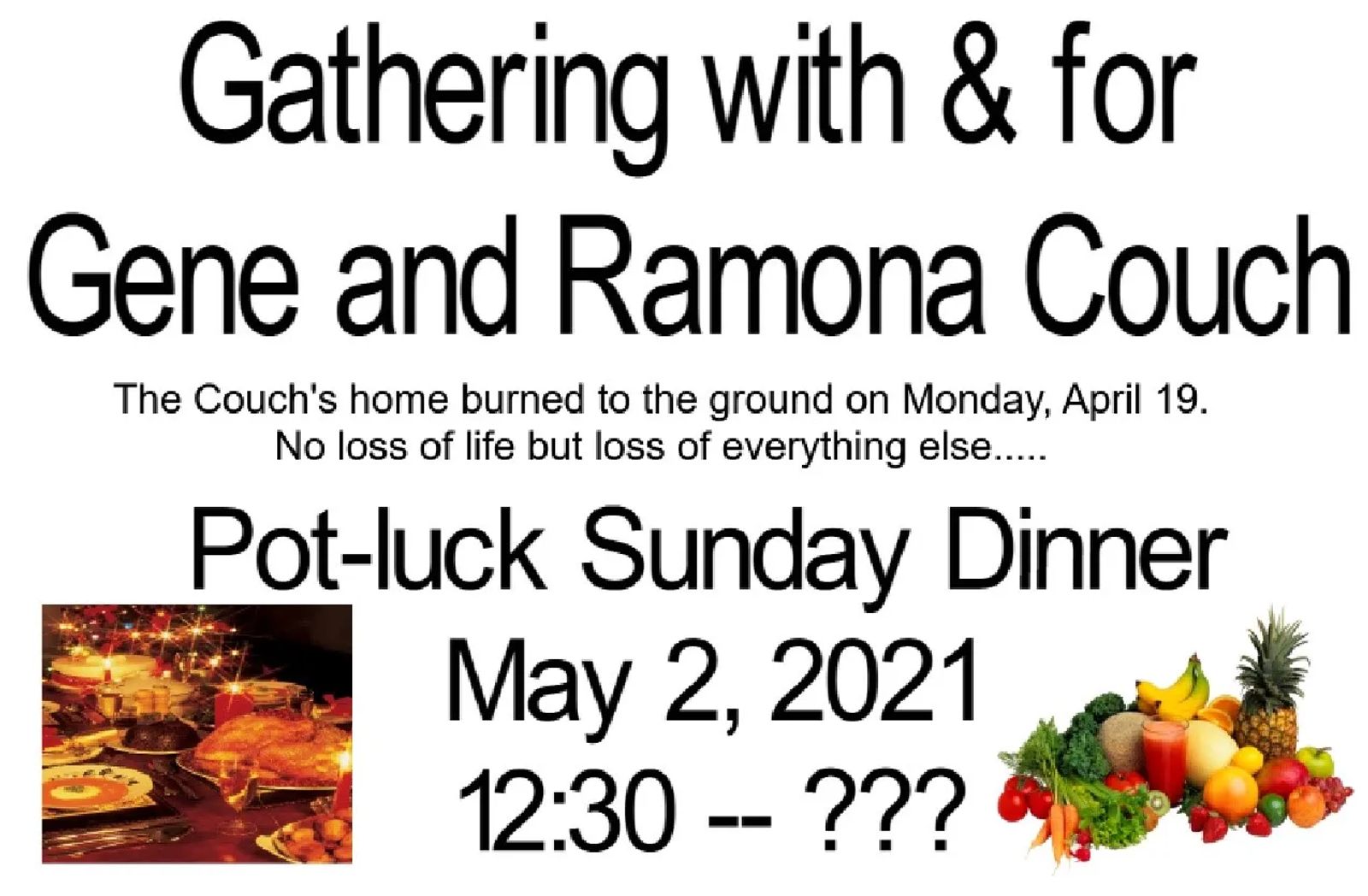 The Couch's home burned to the ground on Monday, April 19. No loss of life but loss of everything else. Come share Sunday dinner and free-will donation. Everyone invited.