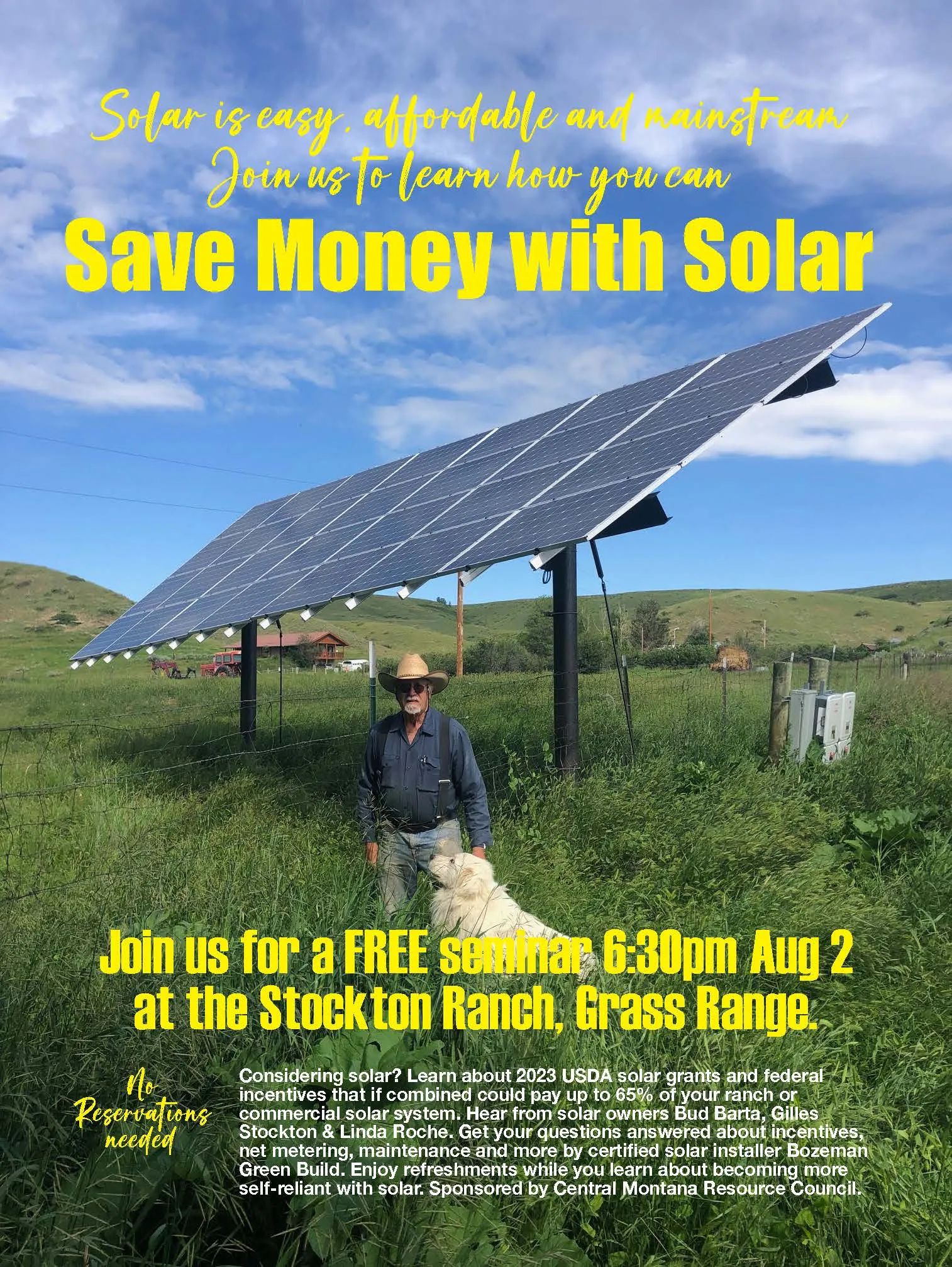 Want to learn how you can save money with solar? Join us for a free solar seminar on August 2 at 6:30 PM at the Gilles Stockton Ranch just two miles from Grass Range at 23090 Forest Grove Road.