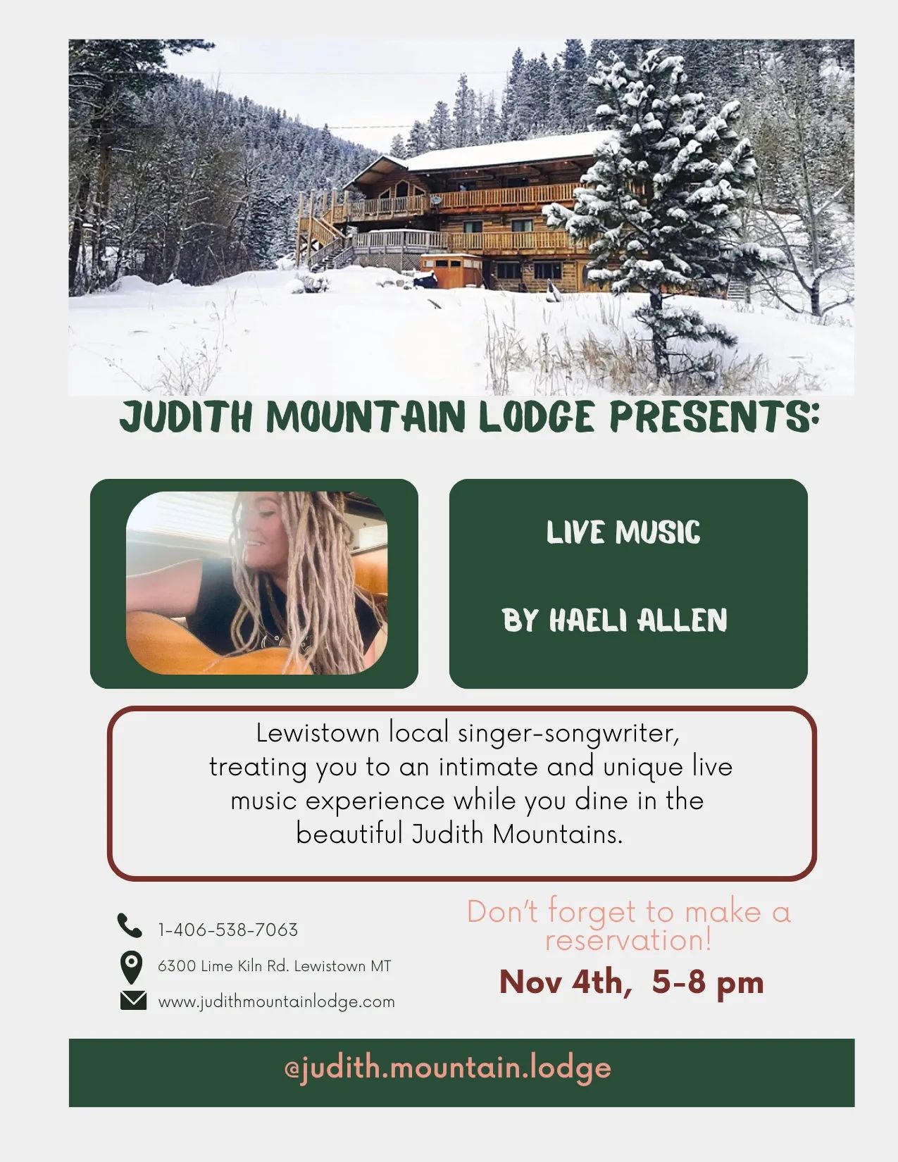 Lewistown local singer-songwriter, treating you to an intimate and unique live music experience while you dine in the beautiful Judith Mountains. Don’t forget to make your reservation!