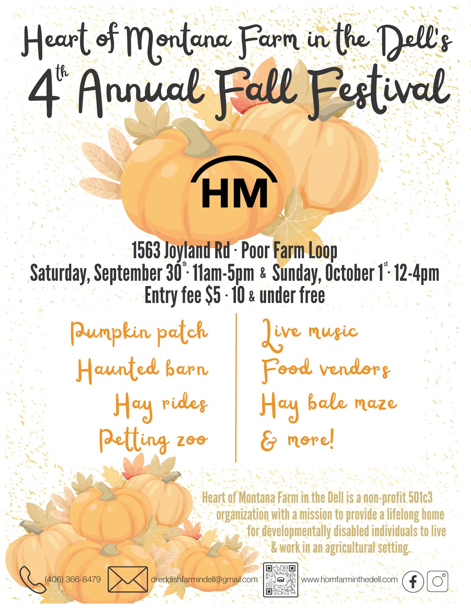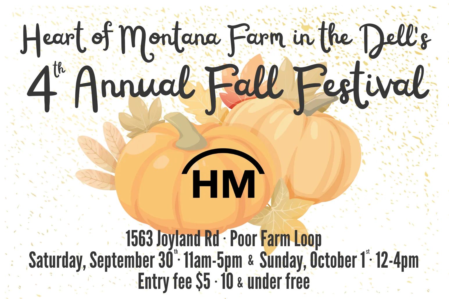 Heart of Montana Farm in the Dell invites you to our 4th Annual Fall Festival! This is our biggest fundraiser of the year, with proceeds going to help build a forever home for individuals with developmental disabilities to live & work on the farm. You can expect pumpkins & gourds galore, a petting zoo, fresh-pressed apple cider, food vendors, live music, hay rides, haunted barn, & fun & games for the whole family!