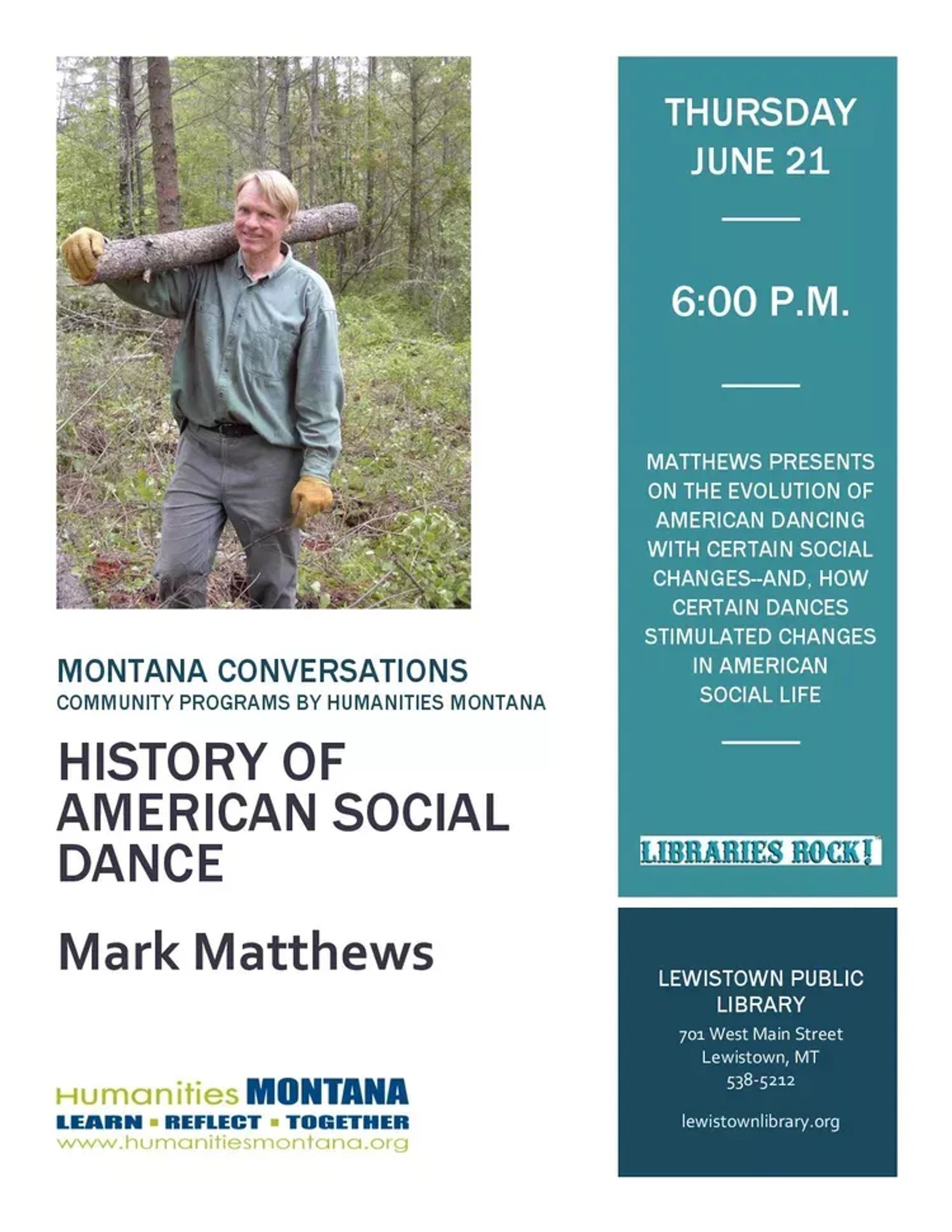 Mark Matthews will present the history of American social dance with readings from his books and writings based on meticulous research, as well as vintage videos and modern recreations of iconic moments in dance. Matthews is a writer, historian, dance caller/instructor, officer with the Missoula Folklore Society, and writing instructor at the University of Montana College of Technology.