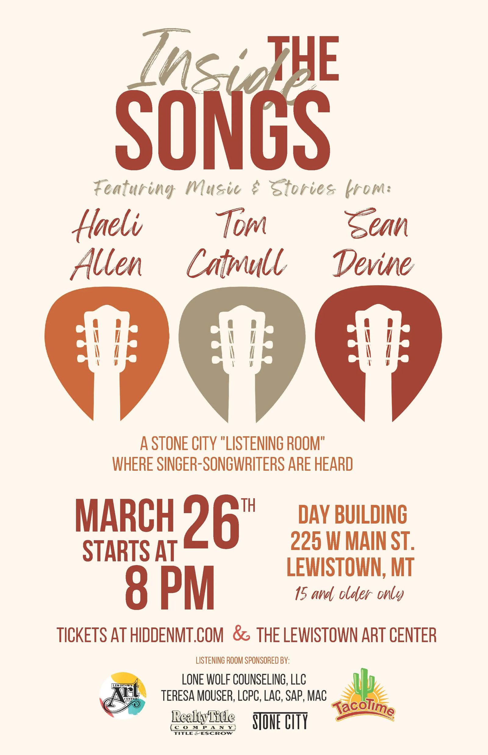 These magnetic shows captivate audiences by getting up close and musical. In March, Haeli Allen of Lewistown MT, Sean Devine of Paradise Valley, MT, and Tom Catmull of Missoula, MT, take the stage together to interact with each other, with you, and to share both their original music and captivating insider accounts of their creativity and experiences.