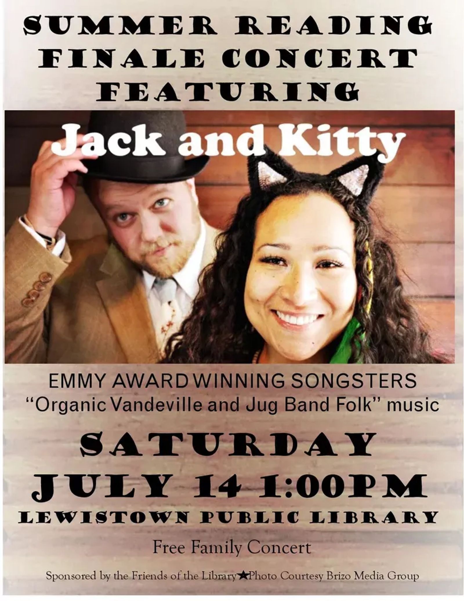 Jack and Kitty will perform for the Summer Reading finale on Saturday, July 14 at 1pm. Jack and Kitty are known for their “Organic Vaudeville and Jug Band Folk” music. The Emmy Award-winning duo perform nationwide and will entertain with a variety of instruments: guitar, jug, wizbang, washboard and more! Join us for this free family concert graciously sponsored by the Friends of the Lewistown Public Library.