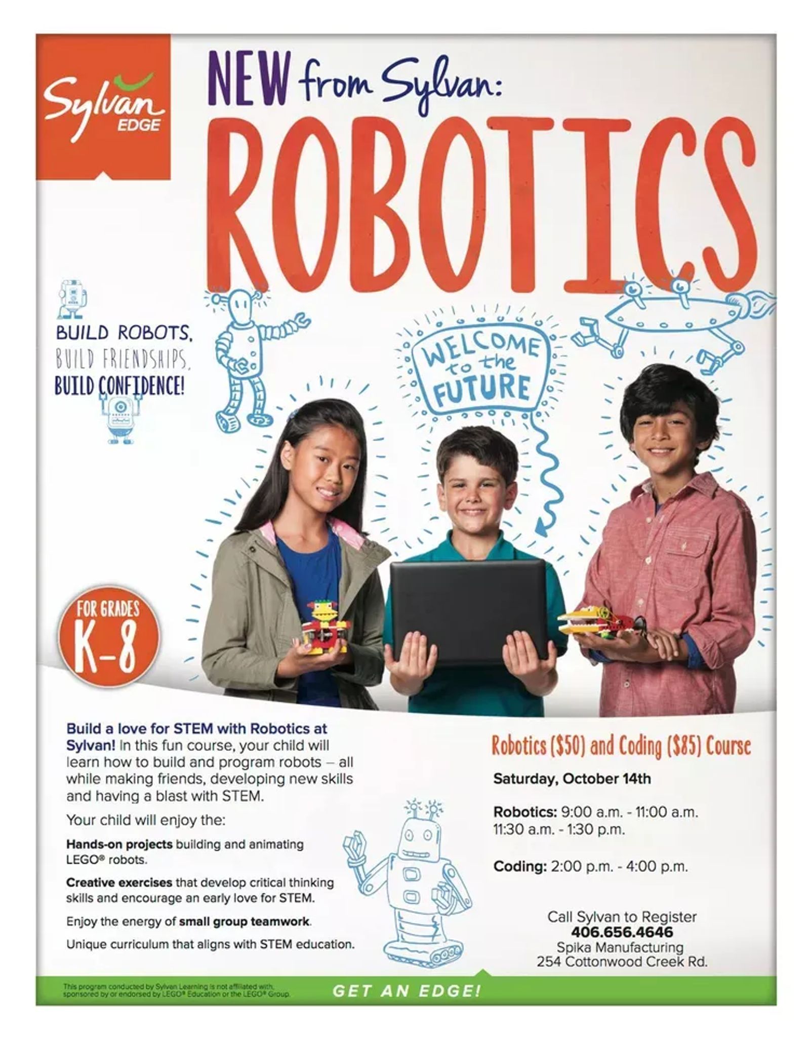 Build a love for STEM with Lego Robotics. In this fun course your child, K-8, will learn how to build, animate and program lego robots-all while making friends, developing critical thinking skills and having a blast. Spaces are limited; call 406-656-4646 to register today!