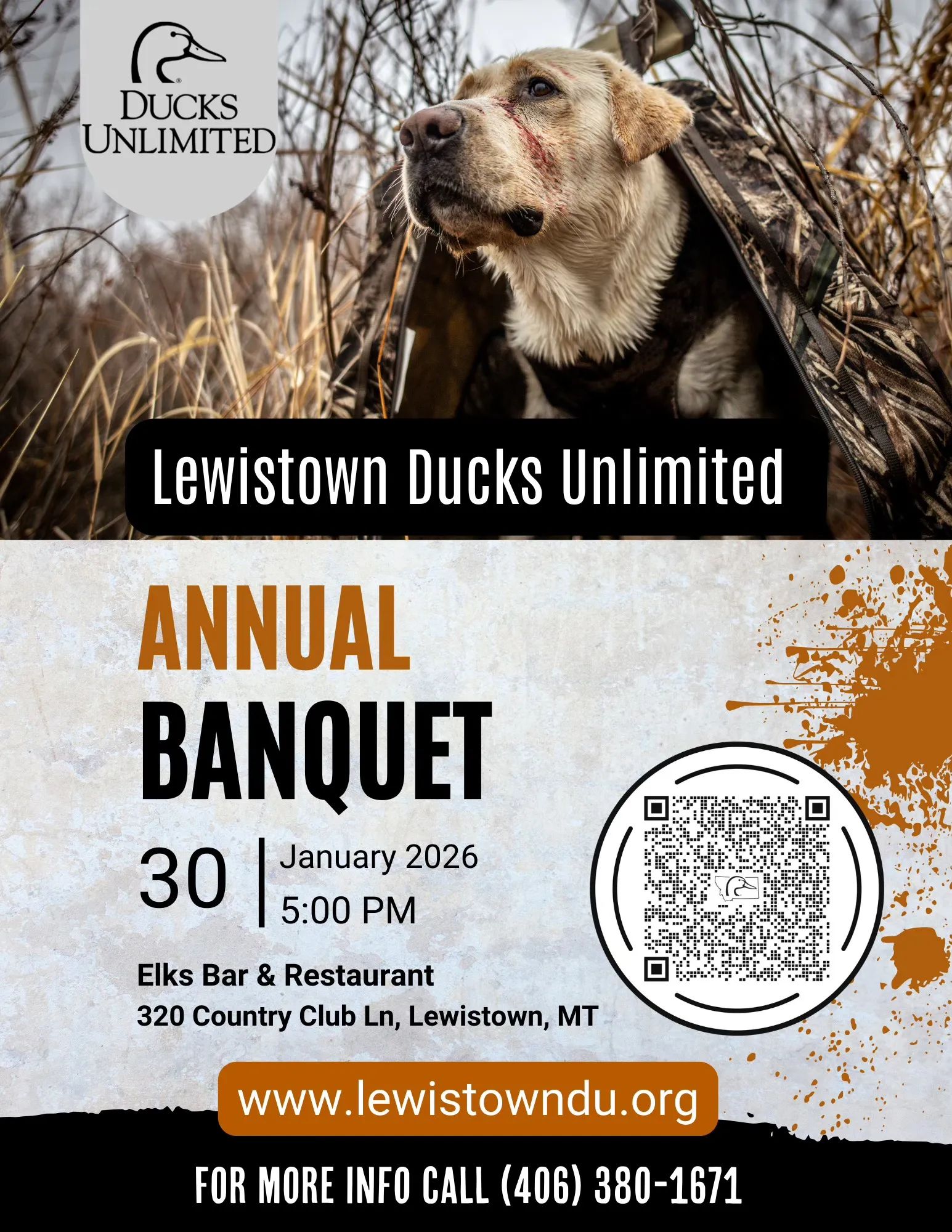 Join us in Lewistown on Friday, January 30 at 5:00 PM for the annual Ducks Unlimited Banquet—an evening filled with good food, drinks, raffles, games, and incredible prizes.