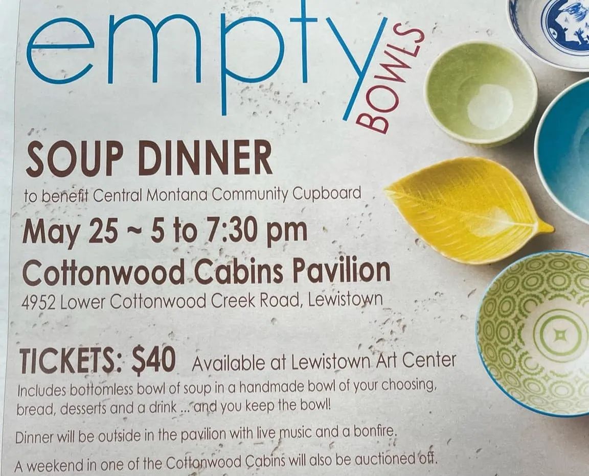 Soup dinner to benefit the Central Montana Community Cupboard. Includes a bottomless bowl of soup in a handmade bowl of your choosing, bread, desserts, and a drink... and you keep the bowl!