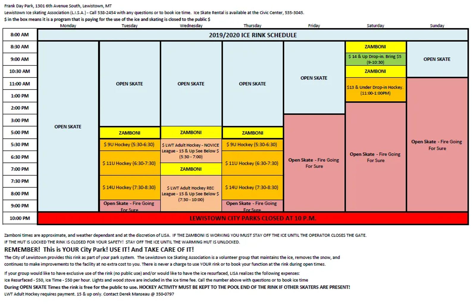 Events, such as hockey games, are scheduled each week during the winter months, but most of the time the rink is available for public use. It may also be rented for parties or special events.