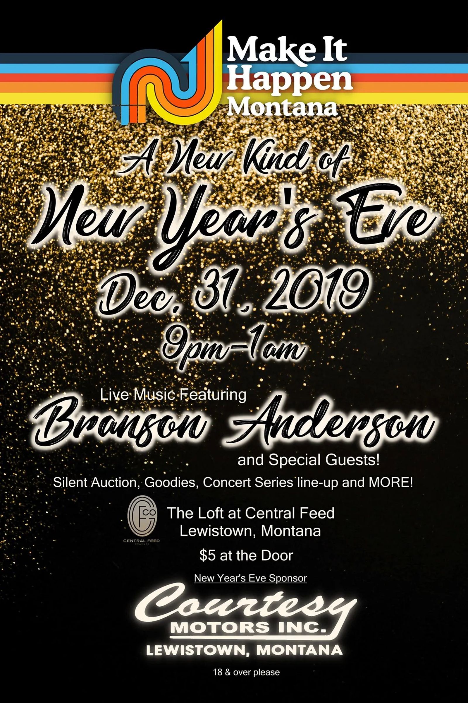 Live Music with Branson Anderson and special guests are coming to Ring in the New Year with a New Kind of New Year's Eve with Make It Happen, Courtesy Motors, and Central Feed in the Loft on New Years Eve! Like always we might make it just a little bit different, but be sure to be ready for music, auctions our spring concert line-up release and FUN! *** please nap before you arrive *** 18 & over please***