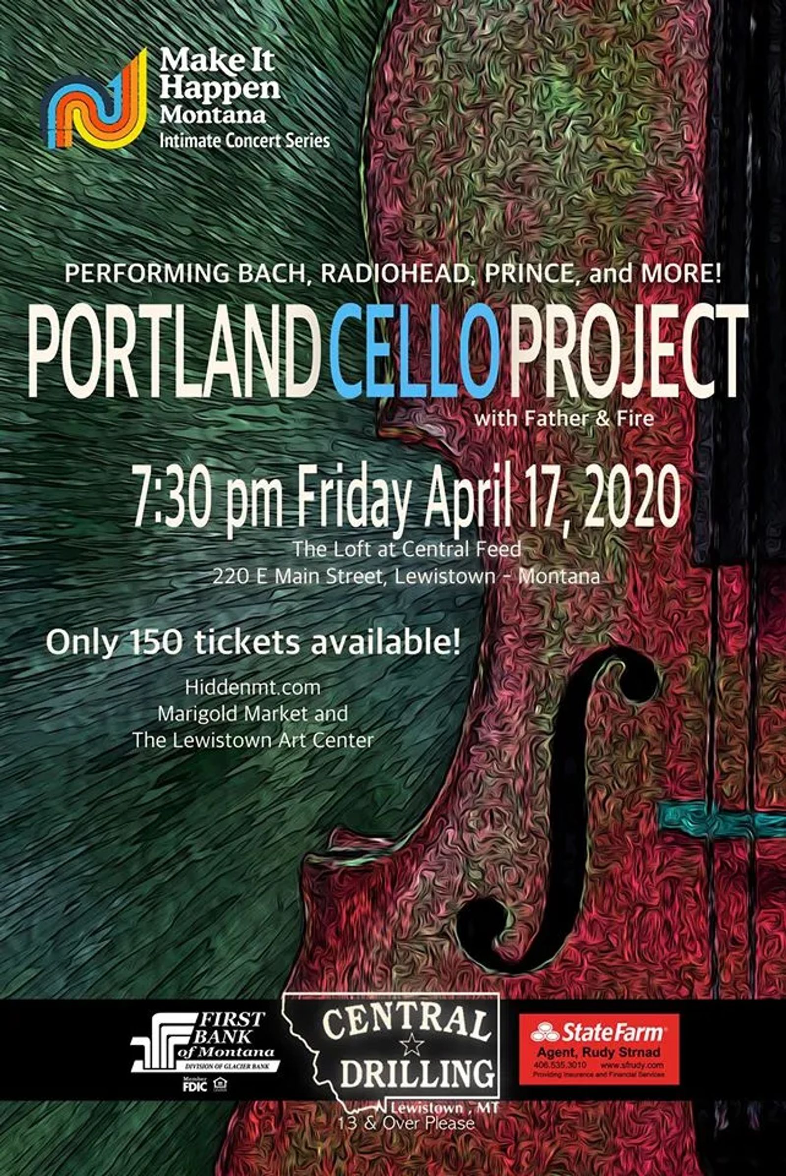 Make It Happen's Intimate Concert Series kicks off with the genre crossing, The Portland Cello Project on September 18, 2020; with opening artists, Father & Fire! Only 150 tickets will be sold for this incredibly intimate concert at The Loft in Central Feed Grilling Company. Bringing 5 cellists, bass, and percussion to Lewistown, Montana this nationally recognized and self-described, "horde of cello's", is known for: