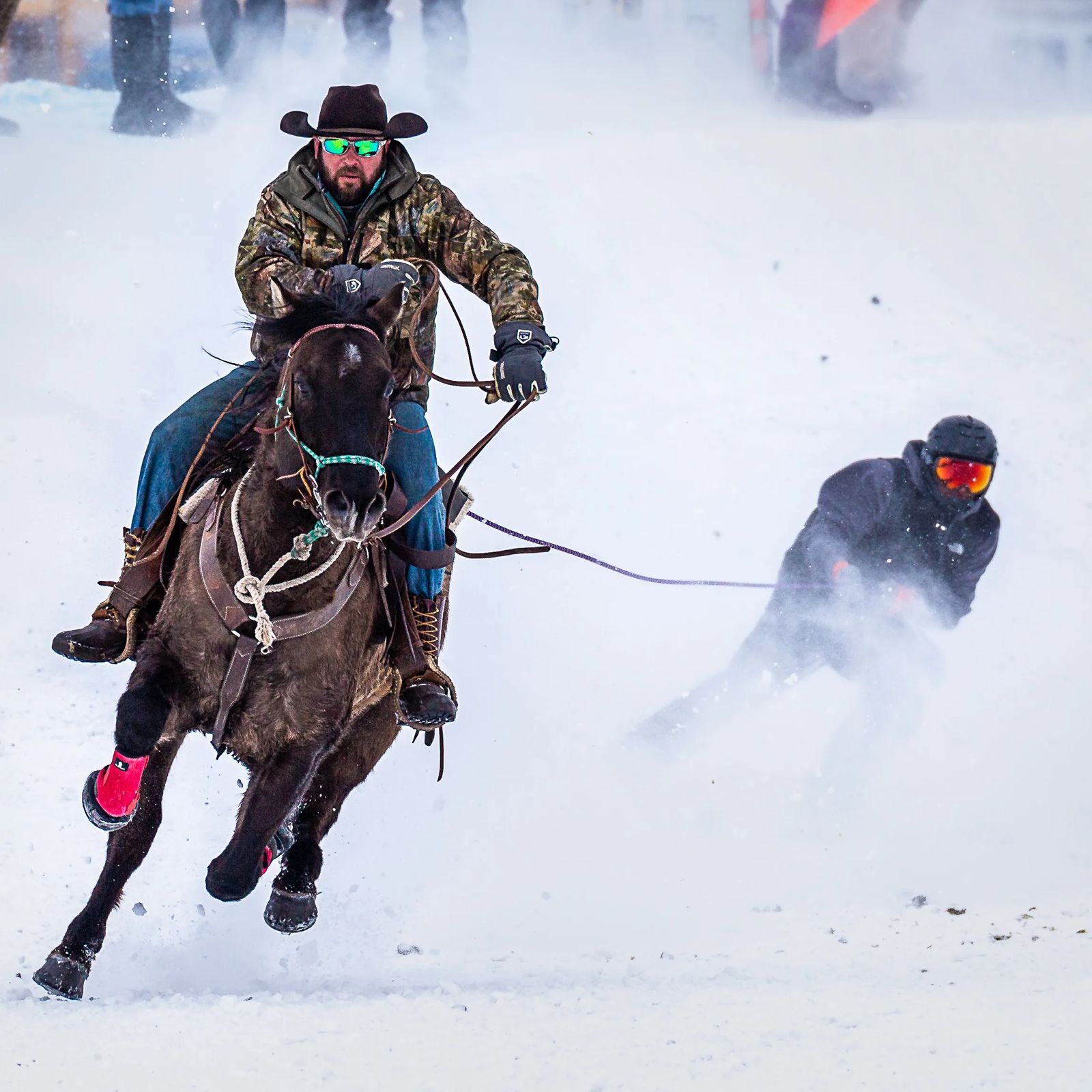 Skijoring is a unique Western tradition that brings together cowboy and ski culture into a an entertaining spectacle that requires coordination between a horse, rider and skier.