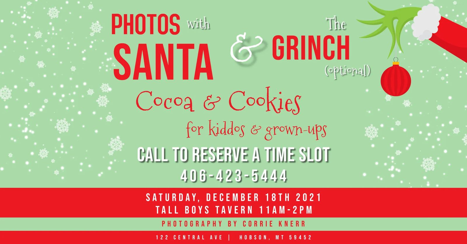 Join us Saturday, December 18th for photos with Santa (& The Grinch)! Cookies and cocoa will be provided! Please call to reserve a time slot! Spaces are limited! 406-423-5444