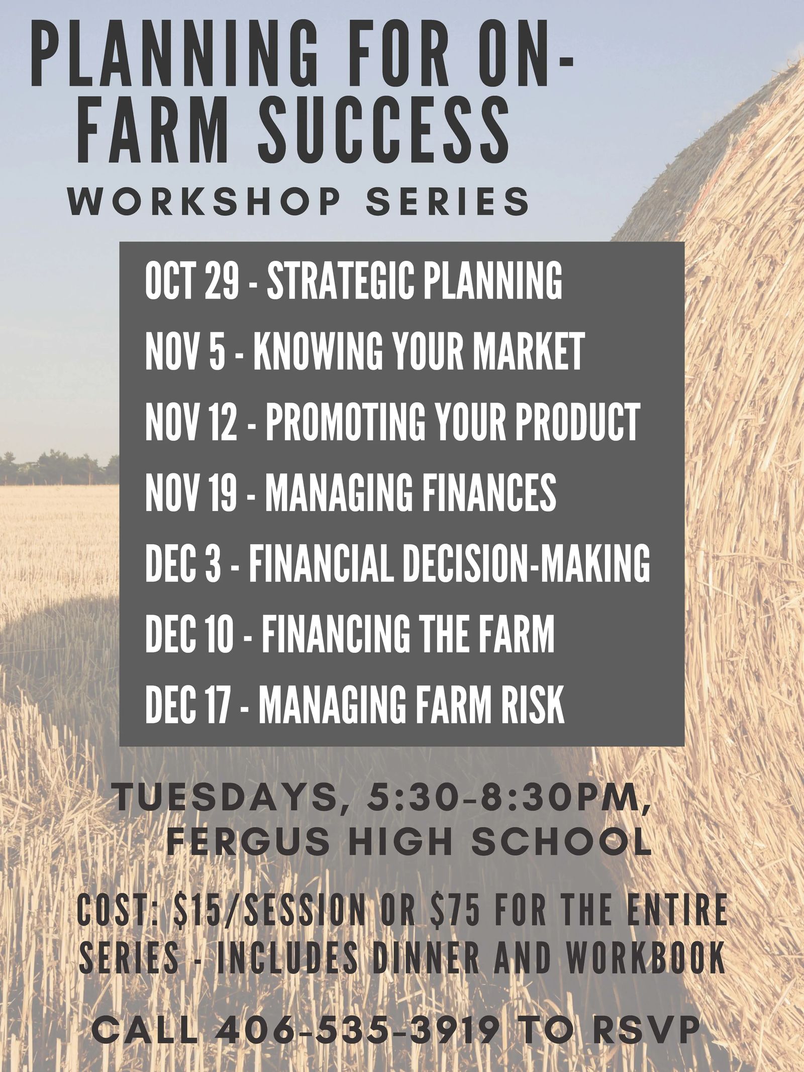 Planning for On-Farm Success is a program made possible by a grant from the USDA, through Farm Link Montana. Anyone interested in the class is encouraged to attend, whether the whole series or just an individual session. Participants can pay $75 for all seven classes, or can pay $15 per session to attend just the classes most relevant to them. Class fees include all class materials and dinner each week.