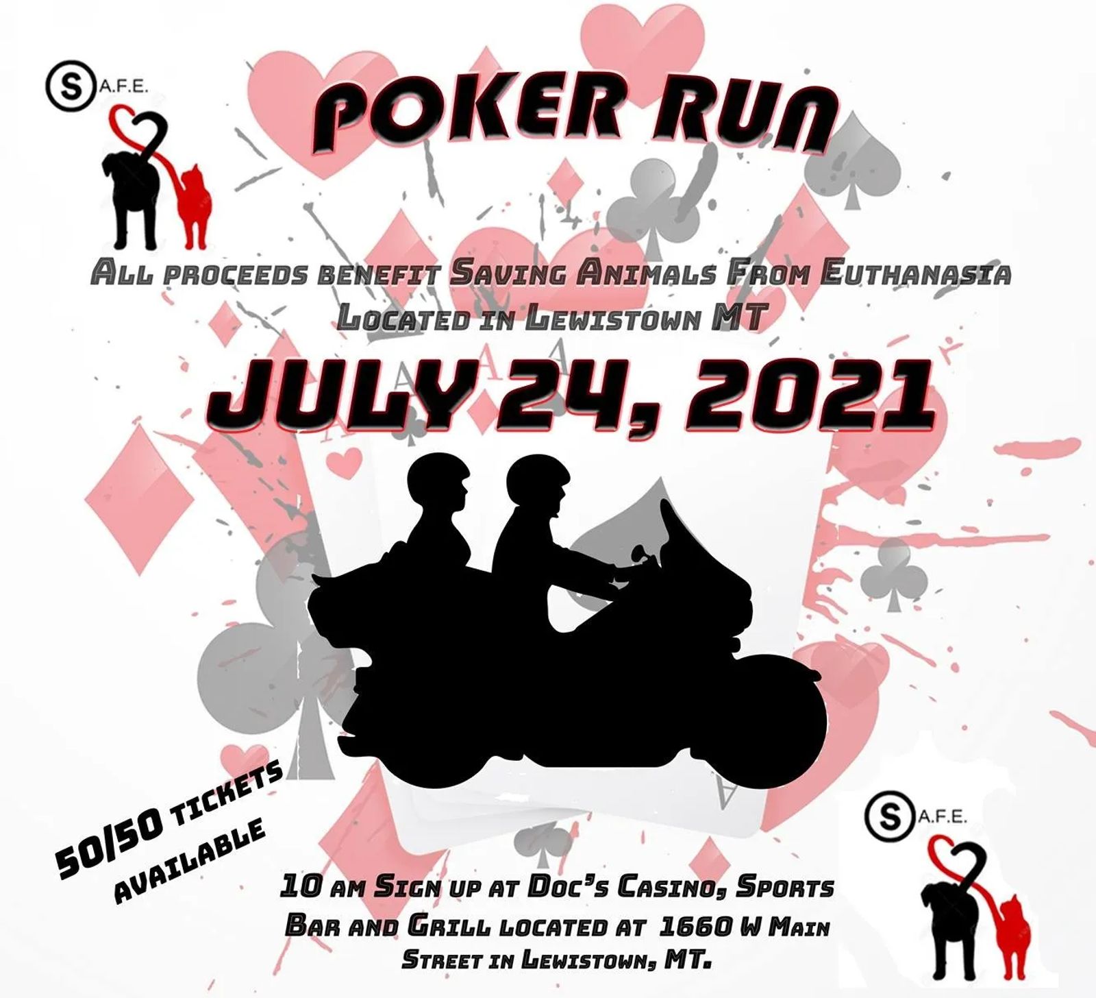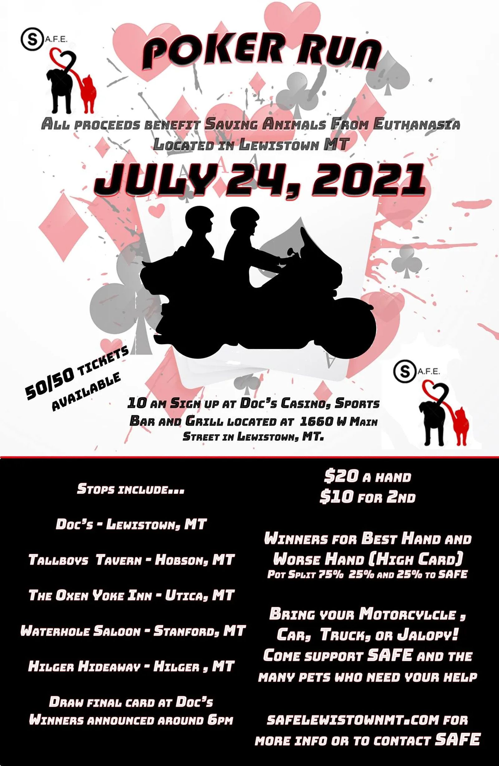 Come join us for a poker run benefiting SAFE in Lewistown, MT. We will have 50/50 tickets and there will be High hand and Worse hand winners. $20 and hand and $10 for a 2nd hand. The pot will be split 75/25/25. Donations welcome.