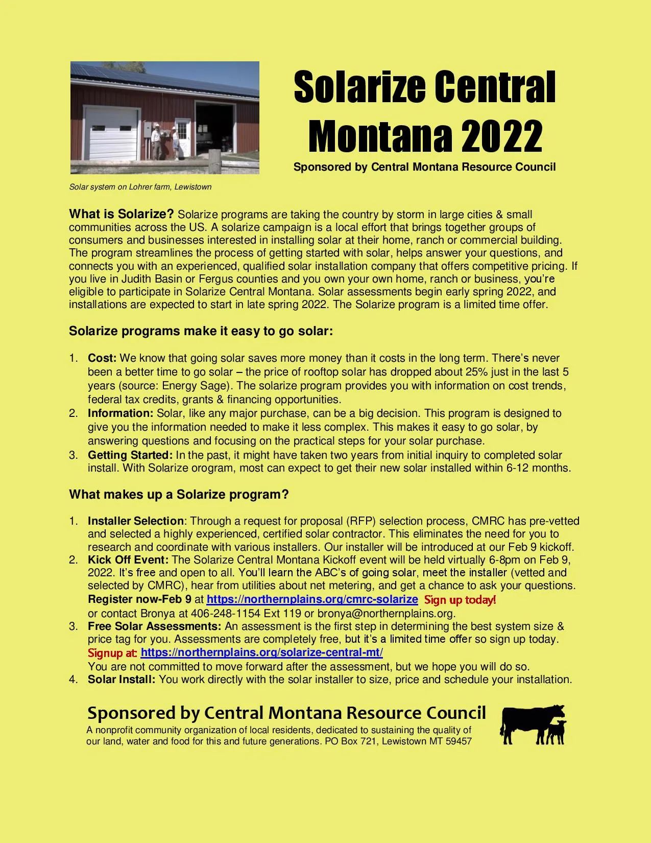 Central Montana Resource Council will launch of “Solarize Central Montana” at a free virtual event 6-8pm Feb 9 via Zoom. Featured speakers include Andrew Valainis, exec director Montana Renewable Energy Association and our selected solar installer. Representatives of Fergus Electric Cooperative and Northwestern Energy will also address net metering. effort that brings together groups of homeowners and businesses interested in installing solar at their home, ranch or commercial building (rooftop or ground mount). Ask your questions about going solar from the comfort of your living room.