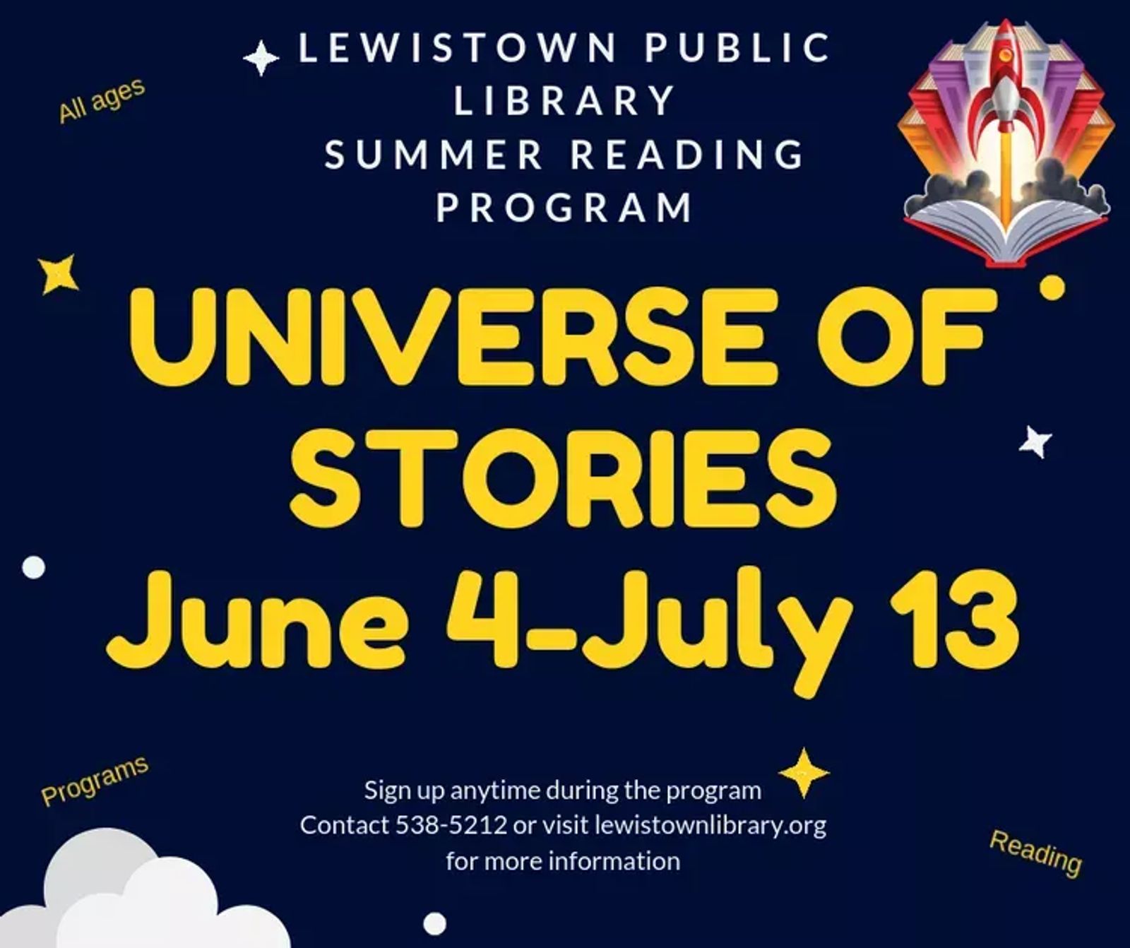 The Summer Reading Program – Universe of Stories - begins on Tuesday, June 4 at the Lewistown Public Library. Summer Reading is for all ages and reading levels. Sign up anytime during the six-week program to participate. Visit www.lewistownlibrary.org for a full schedule of youth and adult programming.