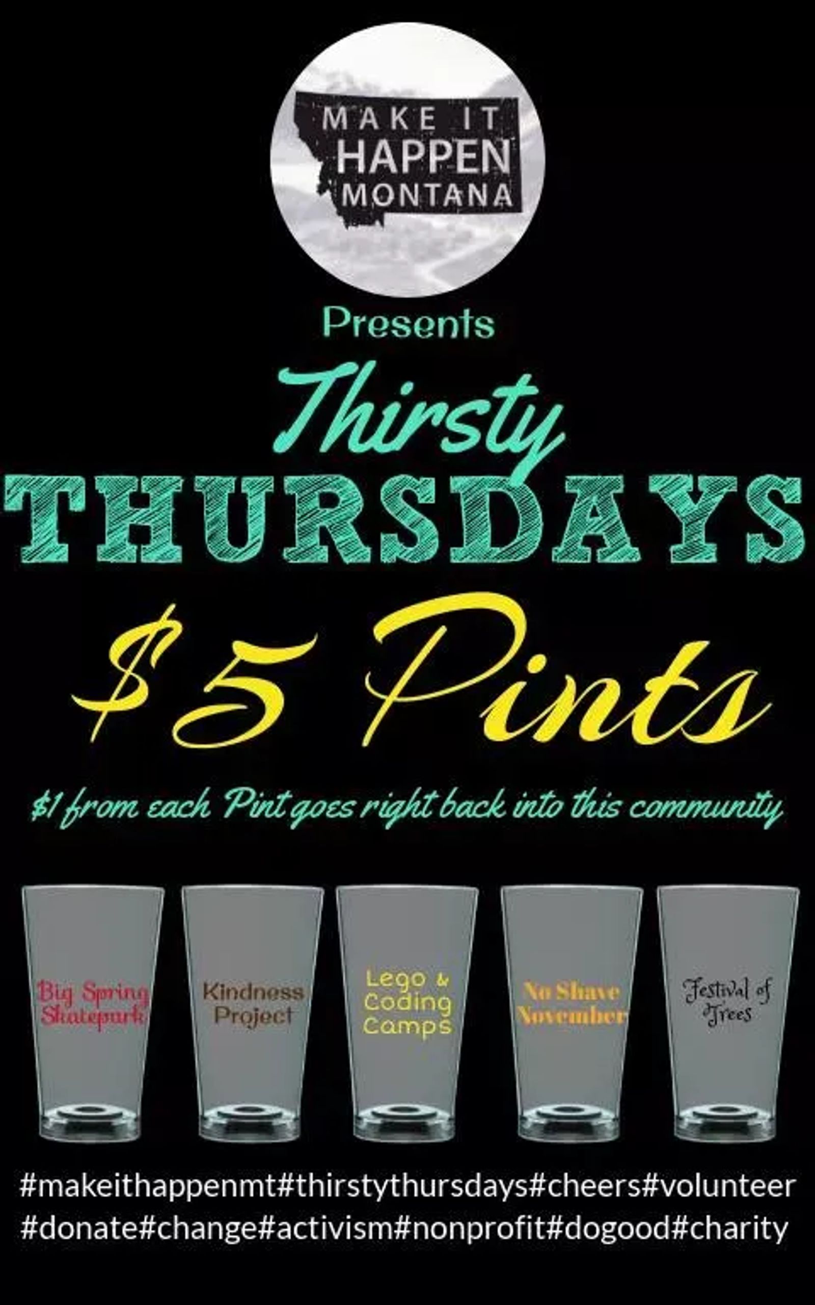During Thirsty Thursdays, The Mint Bar and Grill will donate $1 from each $5 pint sold back to Make It Happen MT to benefit our general fund which provides for but isn't limited to the following projects, Big Spring Skatepark, No Shave November, Lego and Coding Camps, Kindness Project, and our annual donation to the Festival of Trees. 4th Thursday of each month through June-mark those calendars.