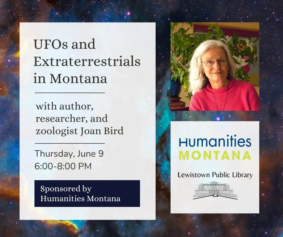 Please join us at the Library on Thursday, June 9th from 6:00-8:00 PM for a Humanities Montana Community Conversation. Joan Bird will present a short course in UFO literacy. You can preview Bird's presentation at https://youtu.be/lDf2x3_7_AU. You're welcome to share your own or your family's stories in this area, too.