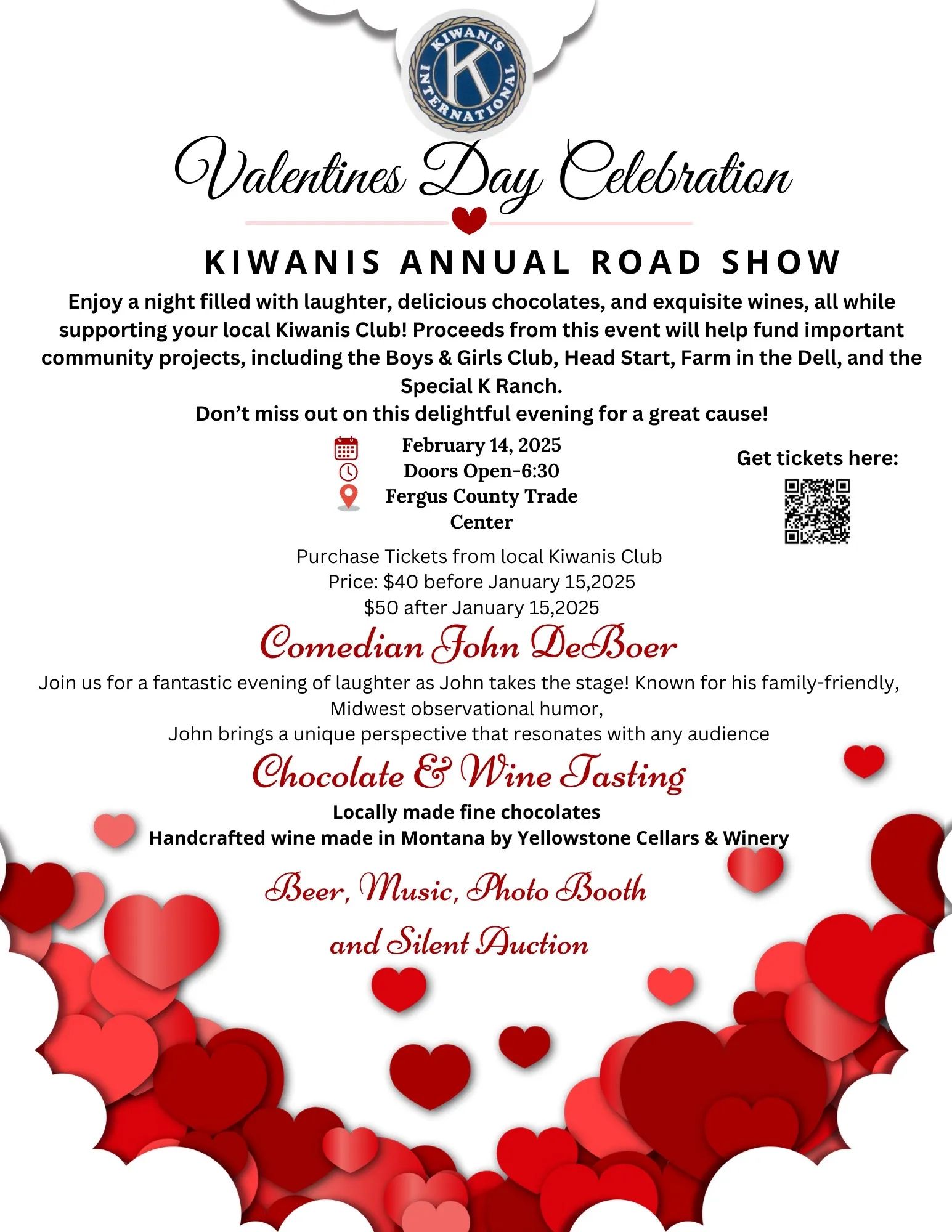 Kiwanis Annual Road Show featuring Comedian John DeBoer, a chocolate and wine tasting, photo booth and silent auction!