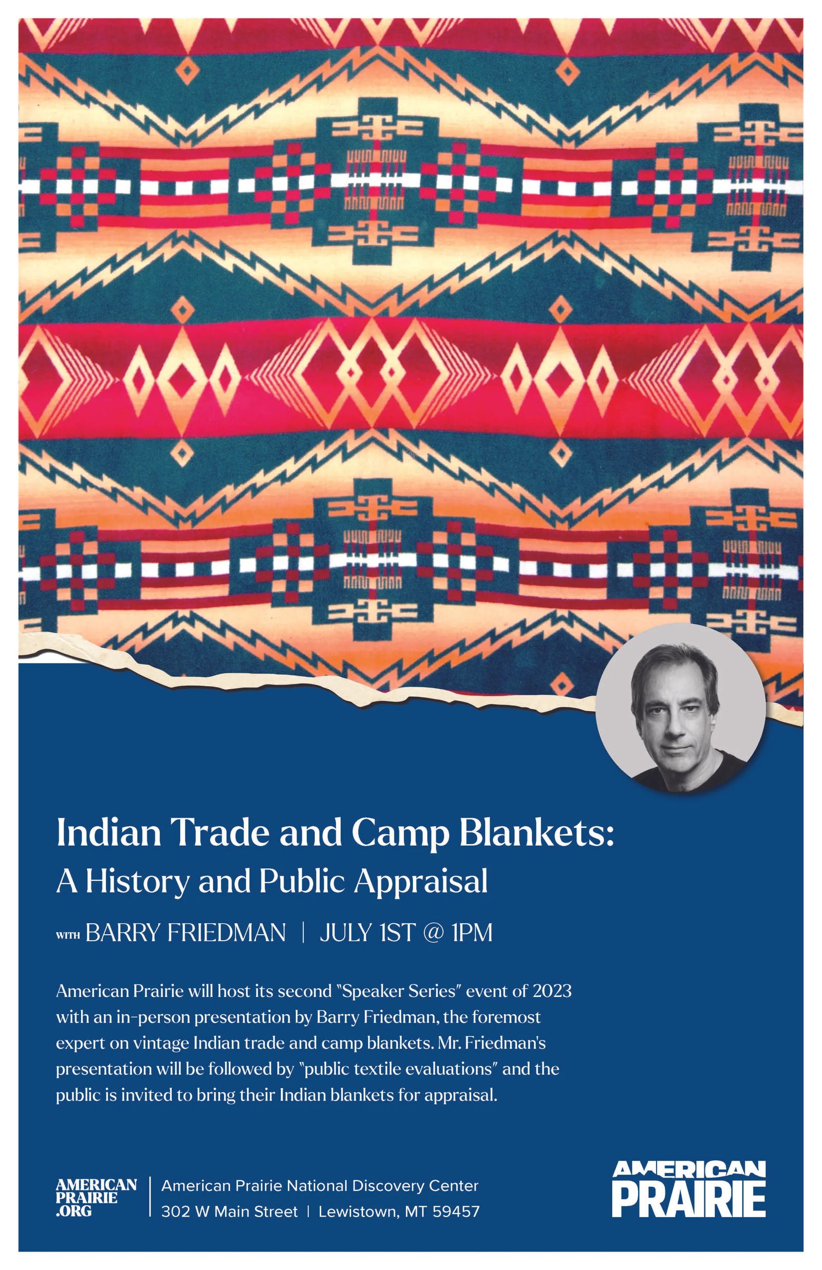 American Prairie will host its second “Speaker Series” event of 2023 with an in-person presentation by Barry Friedman, the foremost expert on vintage Indian trade and camp blankets, at the National Discovery Center in Lewistown on July 1, 2023, at 1pm. Mr. Friedman’s presentation will be followed by “public textile evaluations”, a la Antiques Road Show.