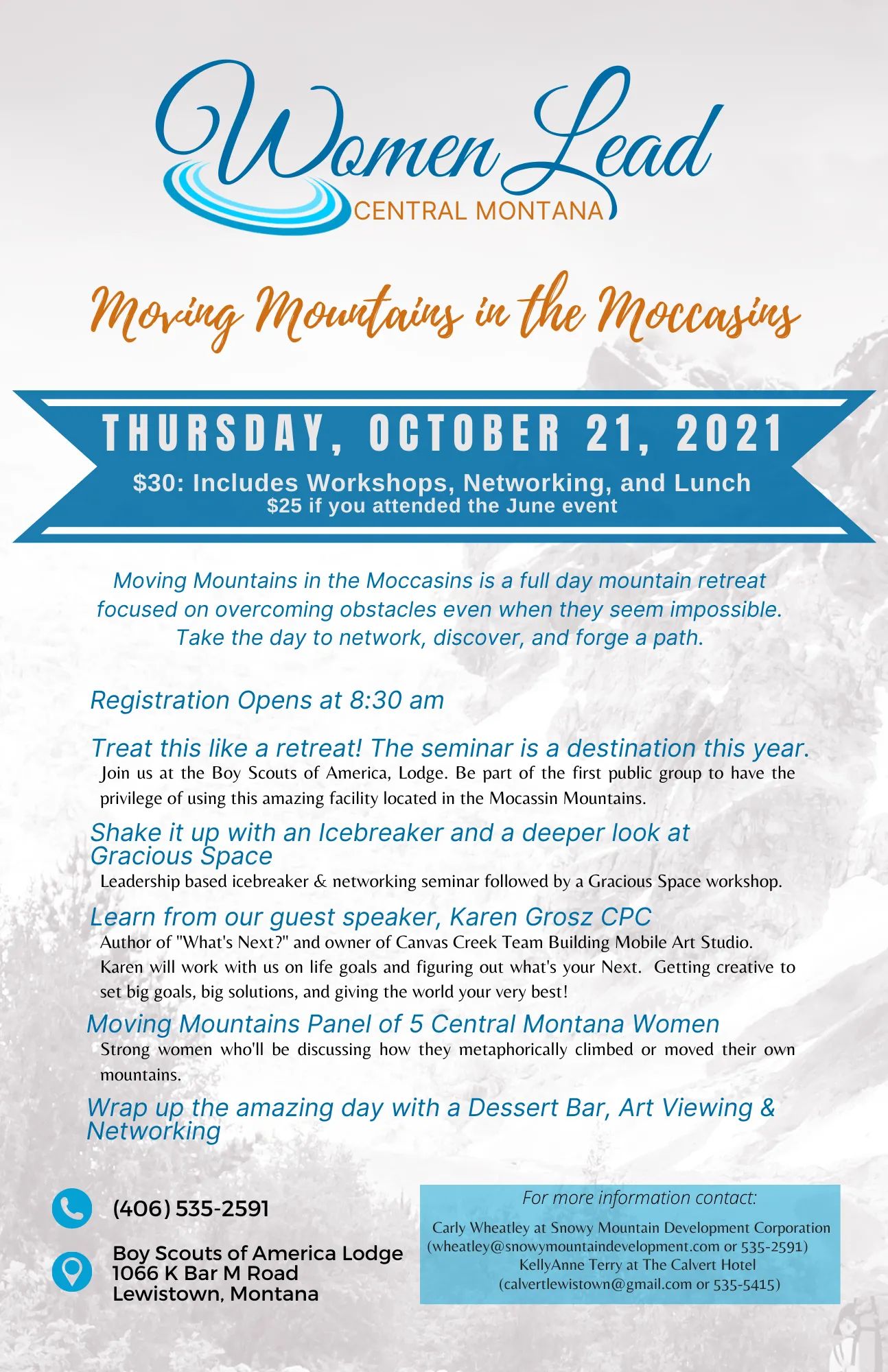It's a retreat this year! We'll be at the Boy Scouts of Americas' new lodge. Registration opens at 8:30 am. Shake it up with an Icebreaker and a deeper look at Gracious Space. Learn from out guest speaker Karen Grosz CPC followed by our "Moving Mountains Panel of 5 Central Montana Women". Then we'll wrap the day up with an amazing dessert bar.