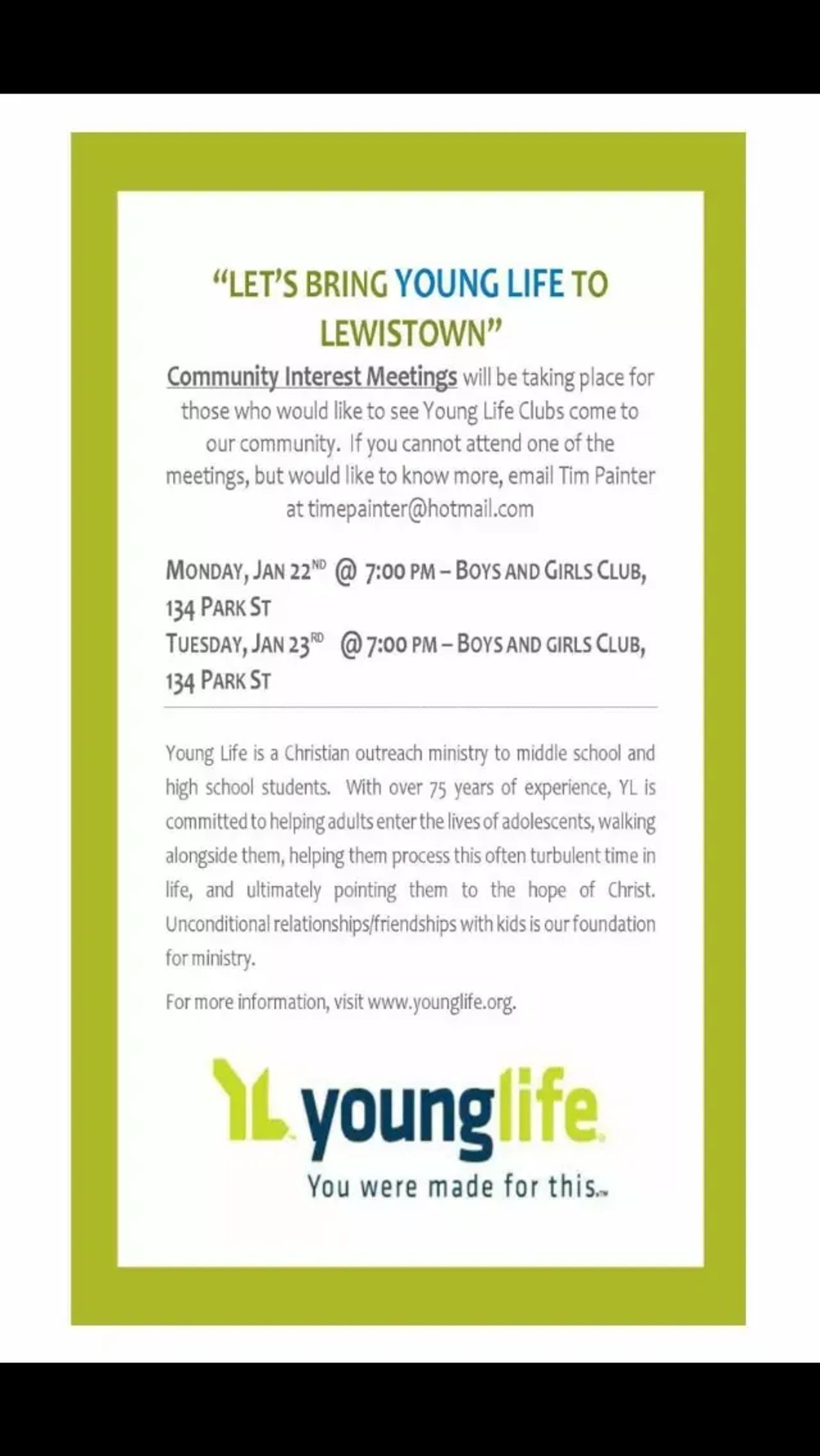 Central Montana Younglife might be what you have been looking for. We are hosting interest meetings on Monday and Tuesday Night January 22nd and 23rd @7:00- 8:15 at the Boys and Girls Club located at 134 Park St in Lewistown. Come and learn about Central Montana Younglife and how you can join in on the adventure of a lifetime. Coffee and snacks provided, kids are also welcome.